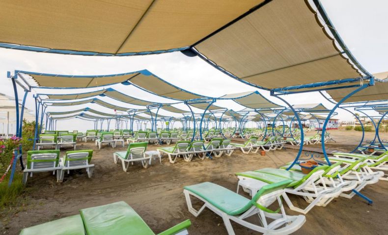Собствен, на 400 м. от хотела, пясъчно-чакълест през подлез. Безплатен шатъл до плажа (по разписание). Чадъри и шезлонги на плажа и при басейна - безплатно. Плажни кърпи – срещу депозит.