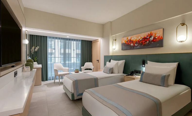 Стаи Main Building - Atrium room (изглед градина - 33 м2); Deluxe room (изглед градина, планина или море – 36 м2), Deluxe Superior room (спалня, единично и допълнитлено легло, изглед градина, планина или море,– 38 м2), Deluxe Superior Family (две помещения, спалня и две единични легла, две бани, 2 балкона, изглед градина или планина – 71 м2), Deluxe room (изглед градина или планина – 36 м2), Deluxe Family (две помещения, спалня и двуетажно легло, две бани, изглед градина – 58 м2).