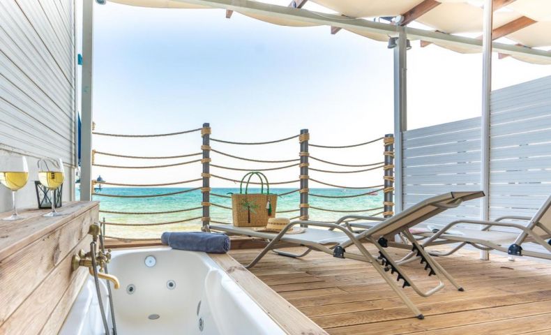 Двойна стая seafront - Построени са точно пред морето с неблокиран изглед към залива Термаикос. Разполагат с голям балкон с градински мебели и собствено джакузи за уникални моменти на релакс до морето. Разполагат с 2 единични легла. (25 m 2 )