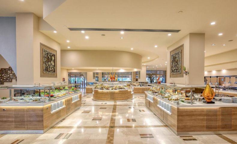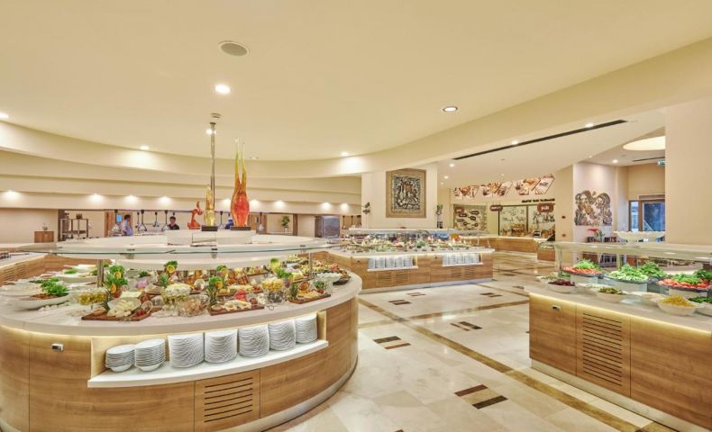Основен ресторант PINA с диетичен, вегетариански и детски кът; 5 а-ла-карт ресторанта (турски MARDIN, гръцки MYLOS, средиземноморски VIRA, италиански PULCINELLA, тепаняки SAKURA - с предварителна резервация, Club Azure/  4 снек ресторанта (Pina, Mylos, Vira, Sunrise); 12 бара  (Sunset Lobby Bar, Sunris  Bar, Vira Event Bar, Pool bar, Sisha Lounge, Mylos Bar, Sakura Bar, Pulcinella Bar, Club Azure/ Beach Bar, Disco Bar), Starbucks, сладкарница, 2 открити басейна, 1 закрит басейн, аква парк с 10 водни пързалки, амфитеатър, СПА център, дискотека, магазини, 9 конферентни зали, паркинг.  На плажа има общо 16 кабани, които могат да се наемат срещу допълнително заплащане, с включен сервиз.