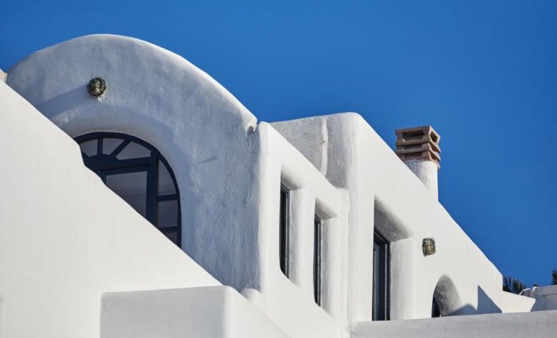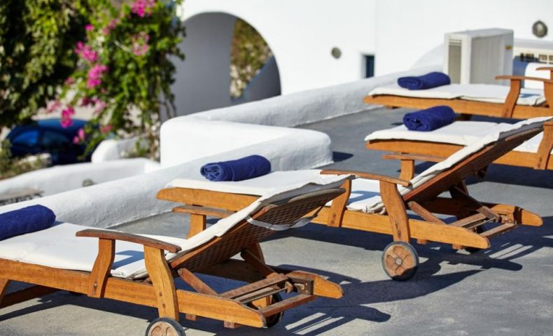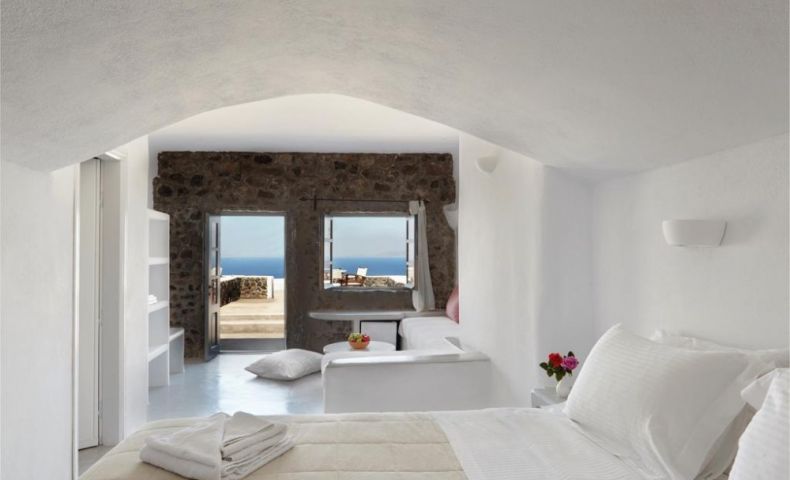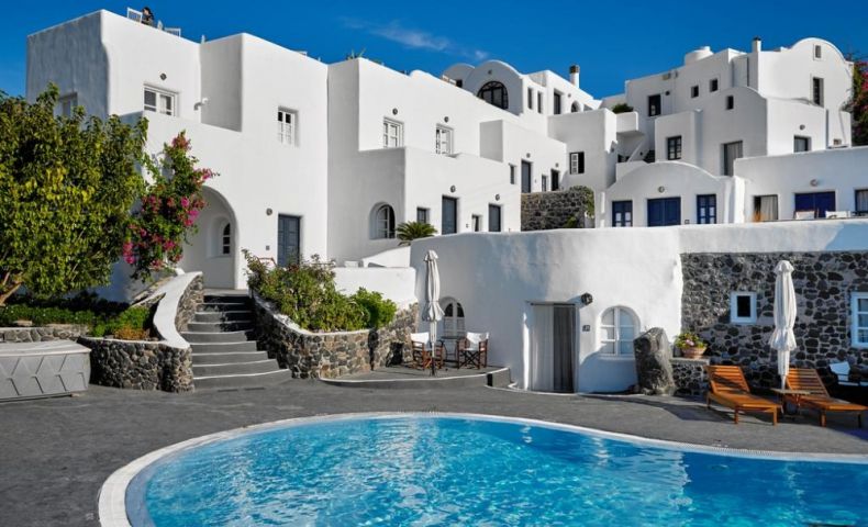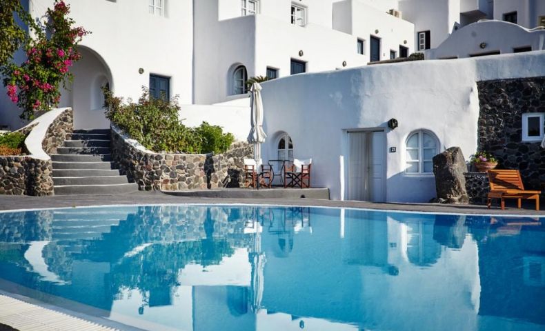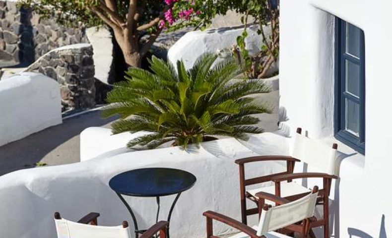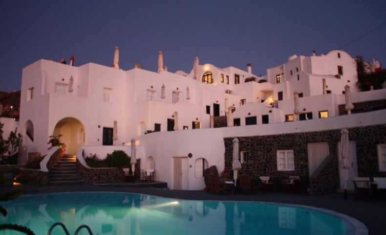 Белият хотел е построен в традиционен цикладски стил. Хотелът разполага с 24 стаи. Всички стаи са оборудвани с климатик, телефон, баня с душ, сешоар, сейф, балкон или тераса с изглед към известния залез на Санторини.