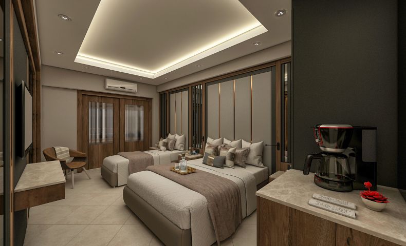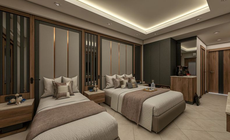 Хотелът разполага с 338 стаи, разпределени в 2 блока - 94 стандартни стаи с изглед градина (20 кв.м.), 95 стандартни стаи с изглед море (25 кв.м.), 20 фамилни стаи с изглед море (две свързани стаи, 35 кв.м.), 3 стаи за инвалиди (25 кв.м.) и промо стаи (без тераси), 37 стандартни стаи (25 кв.м.),11 лукс стаи с директен достъп до басейна (две свързани стаи, 40 кв.м.), 16 дуплекс лукс фамилни стаи (две свързани стаи, 39 кв.м.), 57 лукс фамилни стаи (две свързани стаи, 42 кв.м.), и 3 делукс суита (две свързани стаи, голяма тераса с джакузи, 61 кв.м.). Всички стаи са оборудвани с климатик, телевизор, телефон, баня с душ, сешоар, сет за чай/кафе, мини бар (платен), сейф (платен), балкон. Почистване на стаите - всеки ден, смяна на спалното бельо - 3 пъти седмично, смяна на кърпите - 3 пъти седмично.
