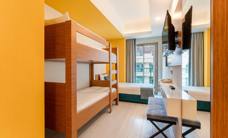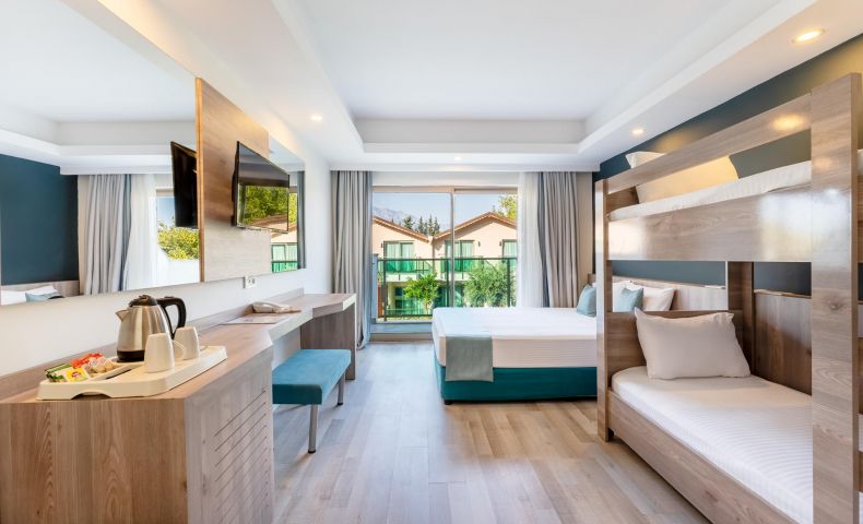 60 Garden Block Standard Room (изглед градина - 26 м2), 275 Standard Room (изглед градина, планина или страничен изглед море - 22 м2), 50 Standard Bunkbed Room (1 спалня и 2-етажно легло, изглед градина или планина - 26 м2), 3 Disabled Rooms (стаи за инвалиди, на първи етаж в основната сграда, гледка градина или планина - 22 м2), 32 Family Room (2 стаи със свързваща врата, 1 спалня и двуетажно легло, гледка градина - 33 м2), 10 Love Suit (спалня, тераса с джакузи, изглед басейн или частично море - 22 м2), 16 Swim -Up Room (спалня, тераса с директен достъп до общ басейн - 26 м2).