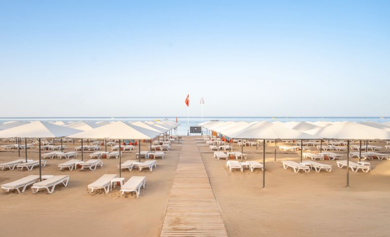 Собствен, пясъчен. Чадъри, шезлонги и плажни кърпи на плажа и при басейна - безплатно.