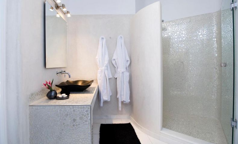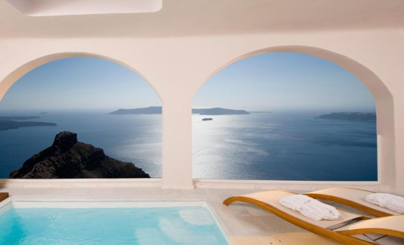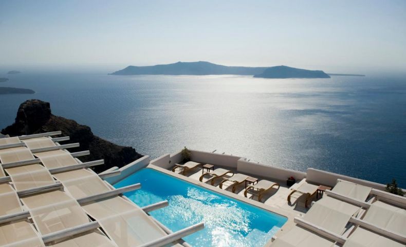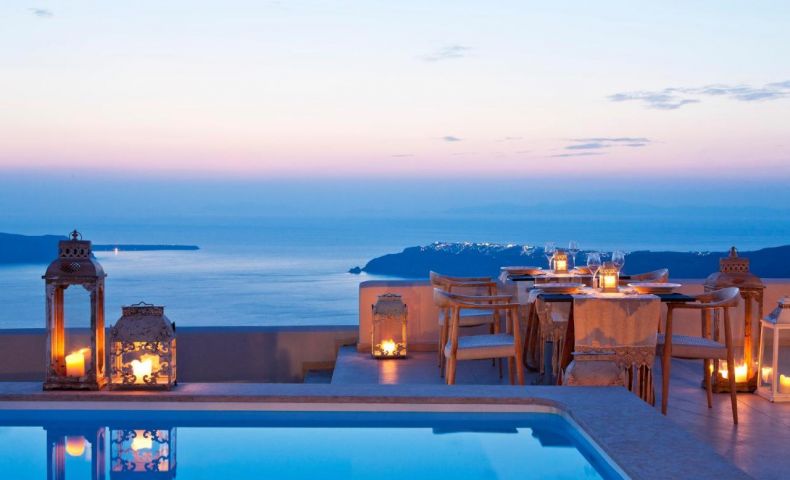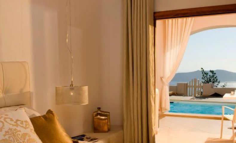 Климатик, телевизор, телефон, сейф в стаята, сешоар,  халати и чехли, тоалетни принадлежности Apivita (гръцка натурална козметика),  Мини бар Nespresso безплатно кафе,  Безплатен WI-Fi 2, собствена веранда с гледка към калдерата и външен отопляем басейн, хамам, рум сервиз. Размер 80 кв. м.