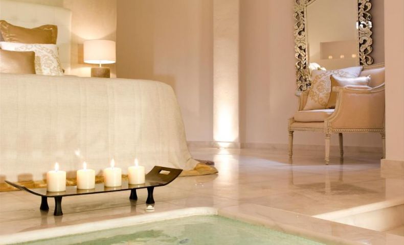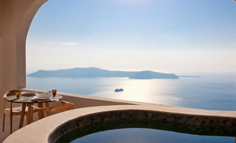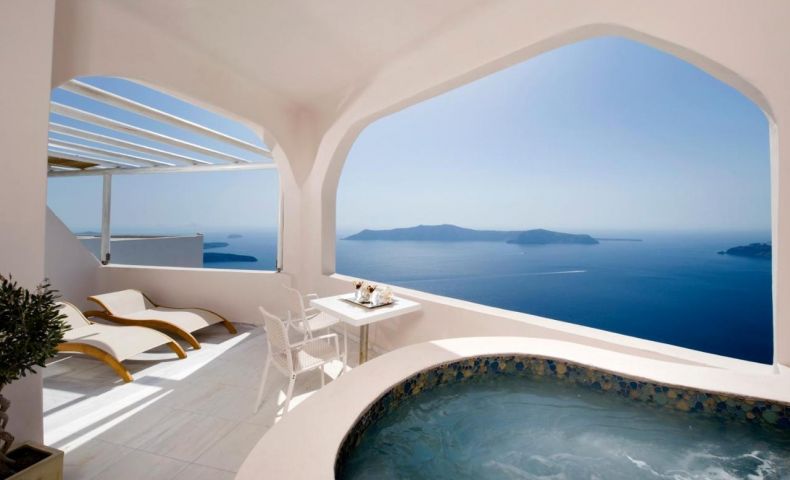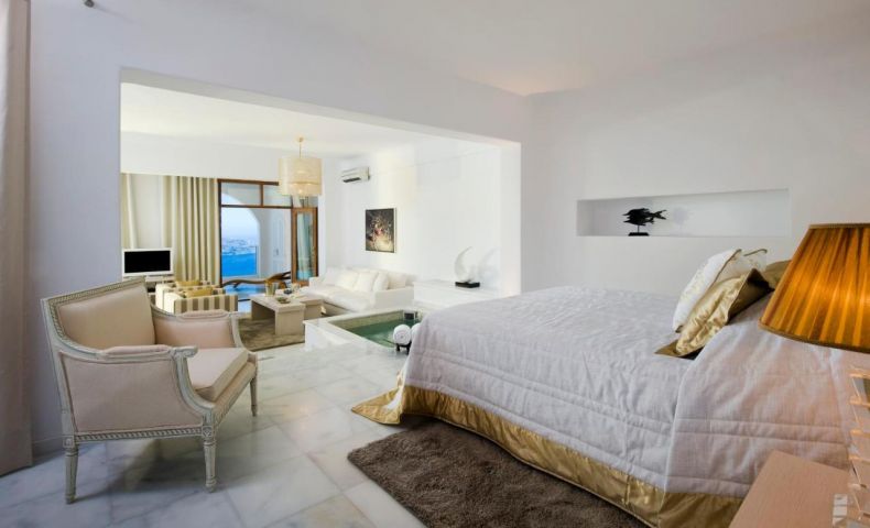 Климатик, телевизор, телефон, сейф в стаята, сешоар,  халати и чехли, тоалетни принадлежности Apivita (гръцка натурална козметика),  Мини бар Nespresso безплатно кафе,  Безплатен WI-Fi, собствена веранда с гледка към калдерата и външно отопляемо джакузи,  рум сервиз. Размер 45 кв. м.