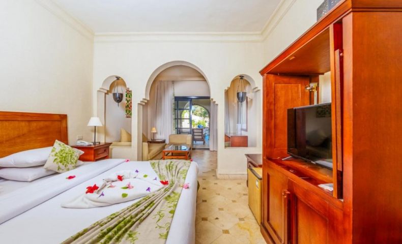 Junior Suite - Просторна стая с балкон, изглед към градината или басейна, двойно легло king size или две отделни легла. Други удобства: разтегателен диван в зоната за сядане, баня с душ, климатик, телефон, хладилник, сейф, сешоар.