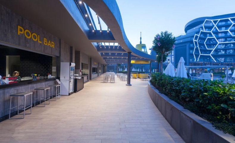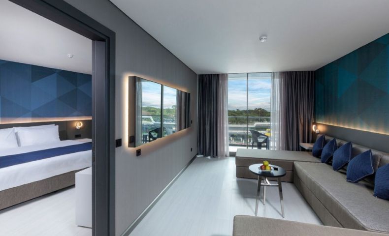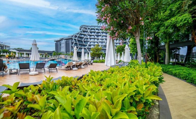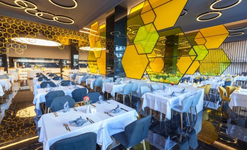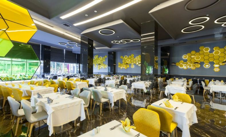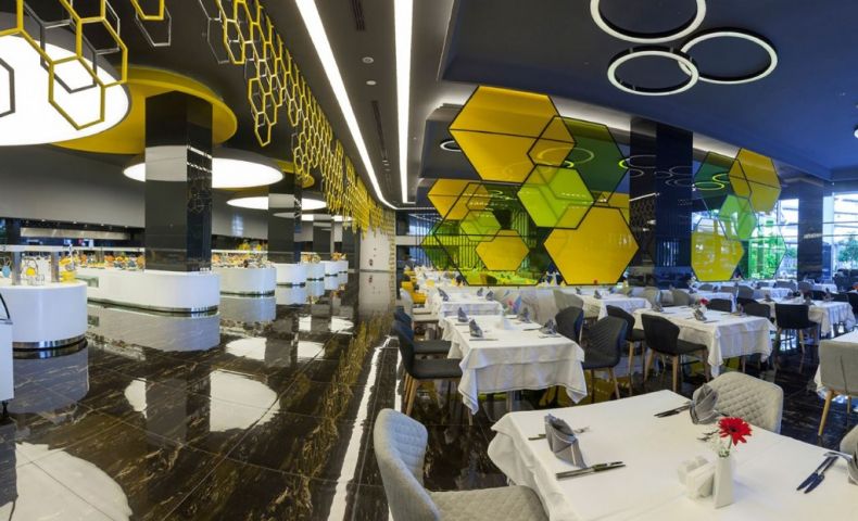 На територията на хотела: Основен бюфет ресторант, 3 бара, 2 а ла карт ресторанта – рибен и турски (едно безплатно посещение за седмичен престой, с предварителна резервация, не се допускат деца под 12 г.), 2 външни басейна (с подгряване 25 градуса), 3 водни пързалки, вътрешен басейн (с подгряване 25-27 градуса), конференти зали.