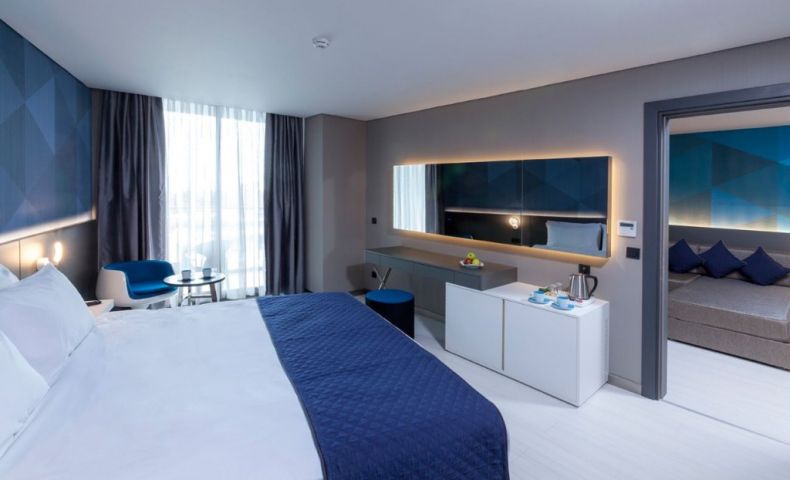 Стаи: Хотелът се състои от една основна 10-етажна сграда и разполага с общо 455 стаи. Те са комфортно обзаведени и проектирани, като висчки излгеждат еднакво, само гледката е различна. Удобства в стаите: балкон, под - ламинат, VRF климатик, LCD телевизор със сателитни и музикални канали, минибар, сейф, електрическа кана, различни видове чай и кафе, телефон с директно избиране, WiFi безжична интернет връзка. Баня: телефон, сешоар и електричество 220 волта. Фамилните стаи представляват две стаи свързани помежду им с врата – една спалня + втора стая с голям разтегателен диван и разполагат с една баня, 2 тоалетни и 2 тераси.