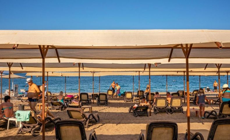 Собствен пясъчно-чакълест плаж на 200 м от хотела. Чадъри и шезлонги на плажа и при басейна – безплатно.