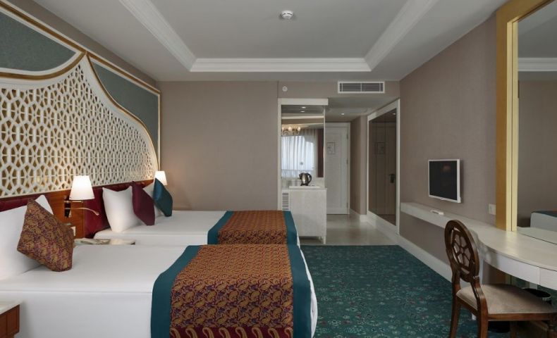 В стаите: Хотелът разполага с общо 450 стаи, от които 356 стандартни стаи и 68 фамилни стаи. Всички стаи са оборудвани с: климатик, сателитна телевизия, телефон, баня с вана, сешоар, минибар - зарежда се един път в деня с вода и бира - безплатно, сейф (безплатно), балкон. Почистване на стаите и смяна на кърпите – всеки ден, смяна на бельото – 2 пъти в седмицата.