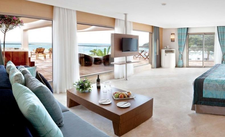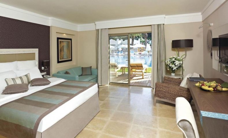 В стаите: Хотелът разполага с общо 268 стаи, разпределени в два 5-етажни корпуса: 88 Standard garden view (33 кв.м), 104 Standard sea view (33 кв.м), 36 Standard Pool Side (директен достъп до басейна, с индивидуална тераса с шезлонги - 33 кв.м), 20 Terrace Suite стаи (директен изглед към море, джакузи на терасата, безплатен рум сървис 24/7, комплимент при настаняване - 70 кв.м), 20 Family Suites (гледка градина, спалня и всекидневма с преградна врата, баня с душ и вана - 65 кв.м), 2 Handicapped (пригодени за хора с ограничена подвижност - 33 м2). Всички стаи са оборудвани с климатик, телевизор, телефон, баня с душ, сешоар, сет за чай/кафе, минибар (ежедневно зареждане с вода и безалкохолни напитки - безплатно), сейф (безплатно), балкон.