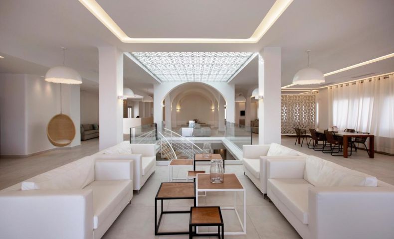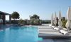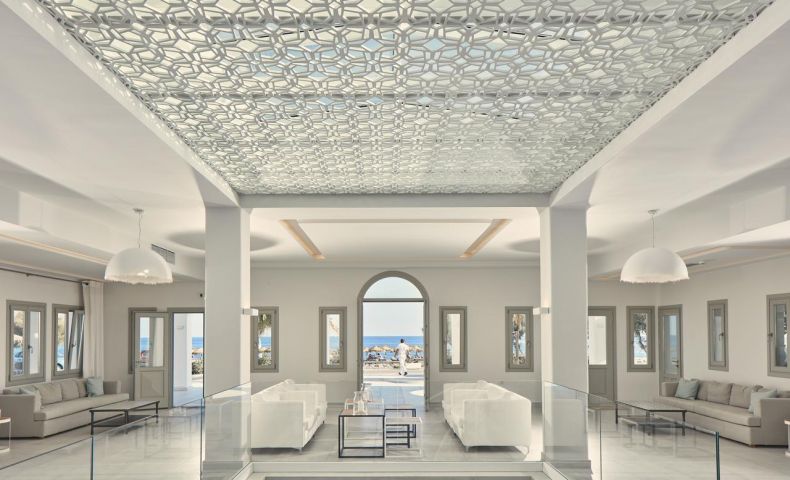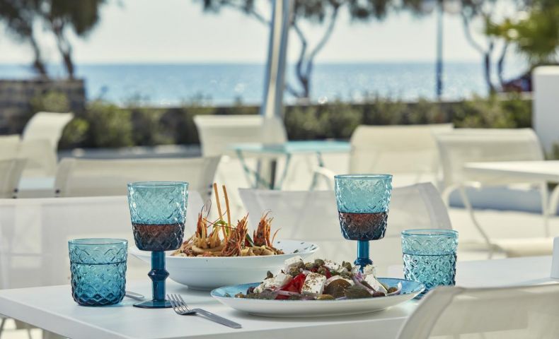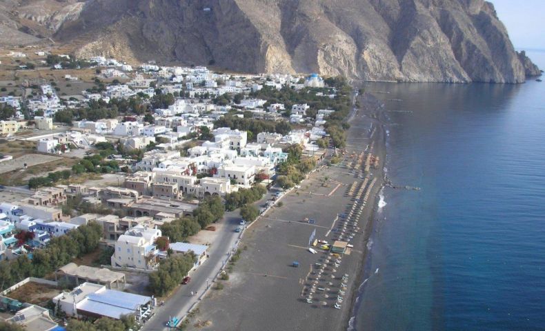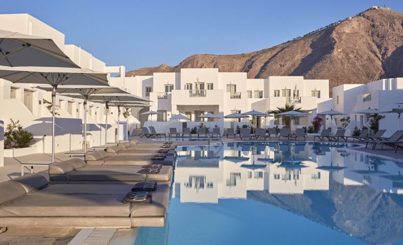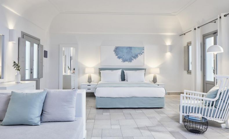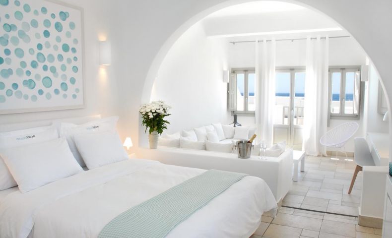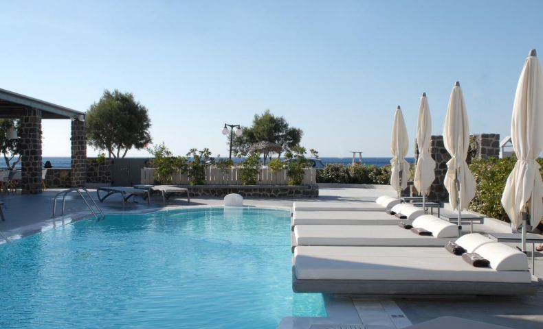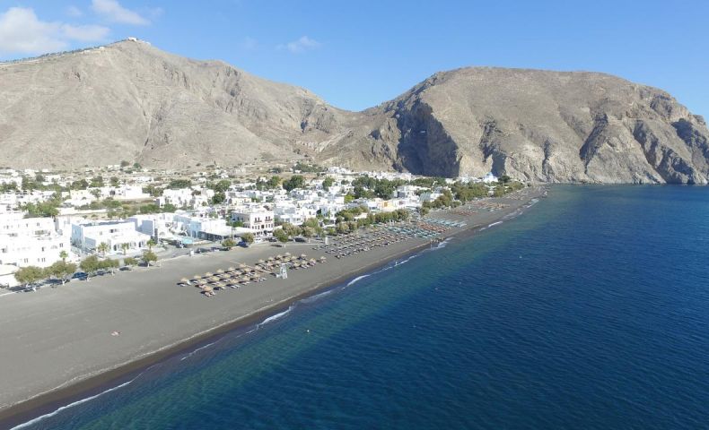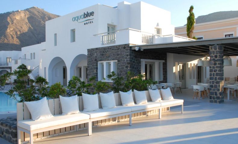 Aqua Blue Beach Hotel е разположен на плажа Периса и разполага с частен плаж с шезлонги и чадъри. Фира, оживената столица на Санторини, се намира на 15 км, а летище Санторини и пристанището са на 20 минути с автомобил. В близост до хотела има условия за водни спортове. Наблизо има и ресторанти, както и други възможности за развлечения.