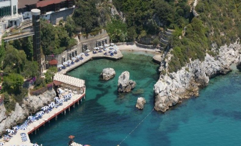 Собствен, пясъчно-чакълест и платформа в малък живописен залив. Достъпът до плажа е по стълби / с асансьор. Чадъри, шезлонги, матраци и кърпи – безплатно