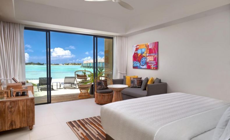 Площ 46 кв.м., с king size легло, подходящо за 3-ма души – Silver Sky Studio предлага стилен интериор, частен балкон с панорамен изглед към океана и модерна баня с душ тип водопад за пълноценна почивка в 5-звезден хотел на Малдивите.