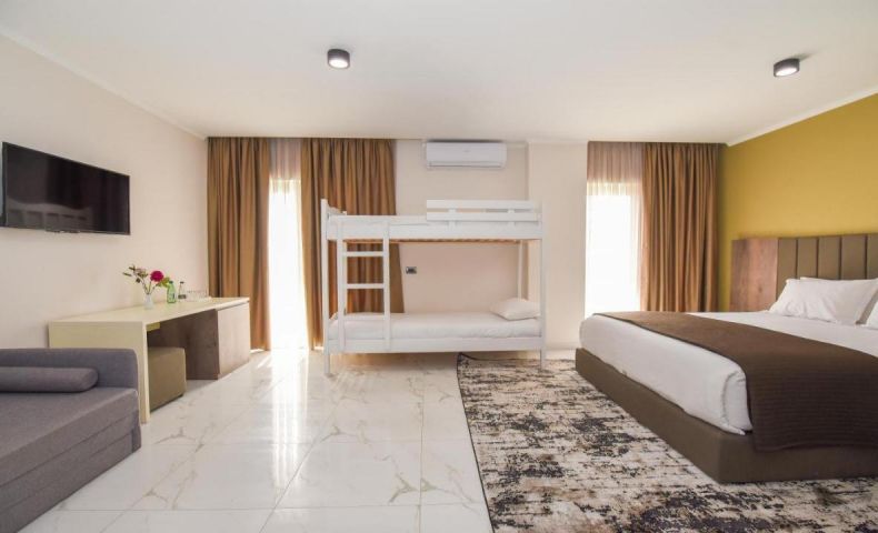 Фамилна или четворна стая: Този вид стаи разполагат с 1 двойно легло и 2 единични легла. Подходящи са за семейства, стаите са просторни. Разполагаме с 8 четворни стаи, като 6 от тях са с изглед към морето. Стаите разполагат с: