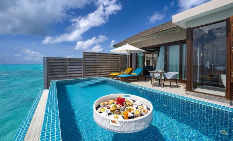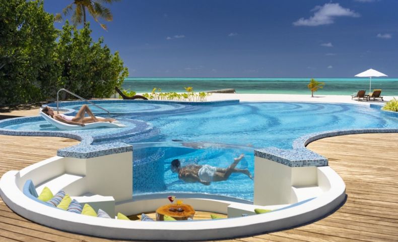 Потопете се в луксозно островно бягство в плажни вили с басейн. Насладете се на гледка към лазурната лагуна на остров Канифуши от леглото си. За 2 възрастни и 2 деца или 3 възрастни и 1 дете, с 1 легло Queen, площ 194 м², басейн 36 м².