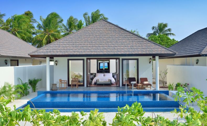 Изживейте перфектната комбинация от островен чар и съвременен комфорт в уединени вили с морска гледка на Малдивите. За 2 възрастни и 2 деца или 3 възрастни и 1 дете, с 1 легло King, площ 146 м², басейн 30 м².