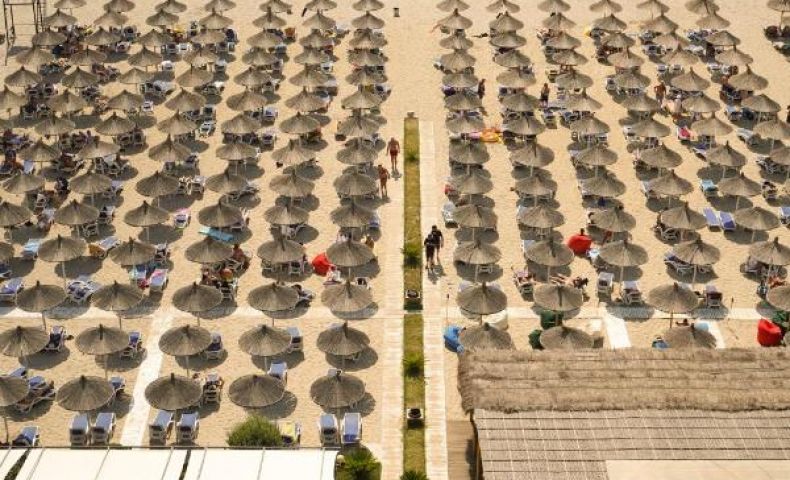 Собствен, пясъчен, на 100 м от сградата на хотела. Чадъри и шезлонги на плажа и при басейна – безплатно, плажни кърпи - срещу заплащане.