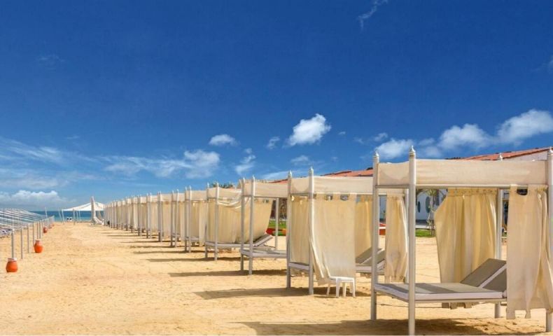 Собствен пясъчен плаж със залив и 3 плувни басейна, включително 1 за деца с чадъри, шезлонги с матраци, плажни огради за защита от вятъра, обслужване от бара, спасители на басейна и на плажа, кърпи за плажа и басейна, табели около басейна;