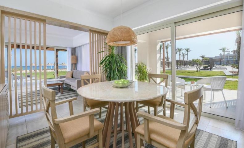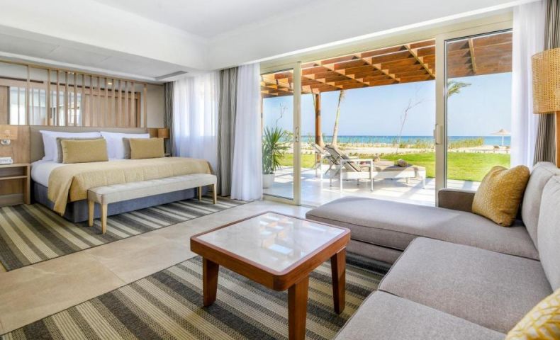 - SUITE FRONT SEA VIEW – 120 кв.м, една стая с двойно легло, диван, трапезария, баня, тераса с директен изглед към морето и достъп до плажа.