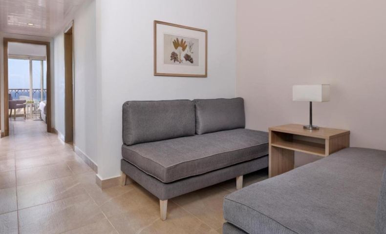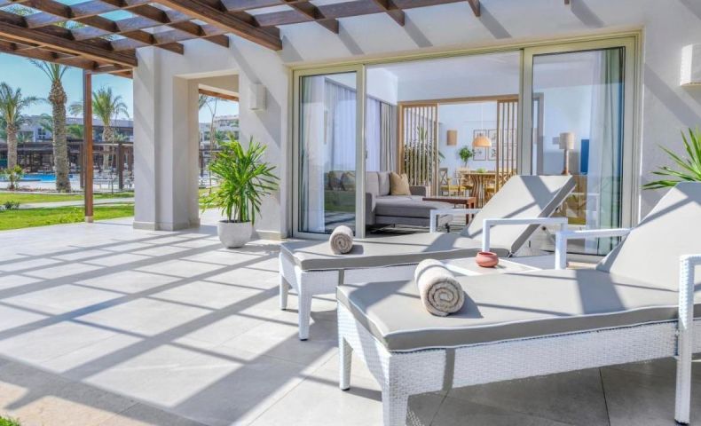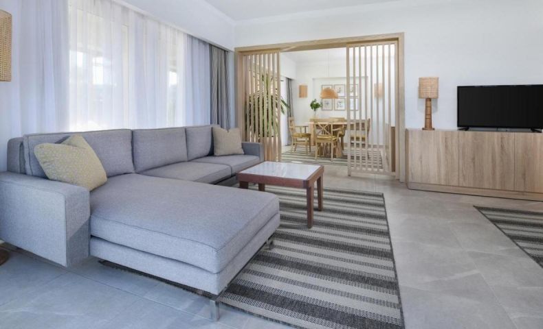 - DELUXE FAMILY ROOM POOL & SEA VIEW- 45 кв.м, една стая с двойни или две единични легла, два дивана, баня, тераса с изглед към басейна и морето.