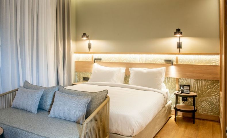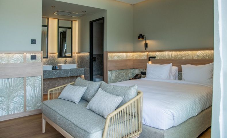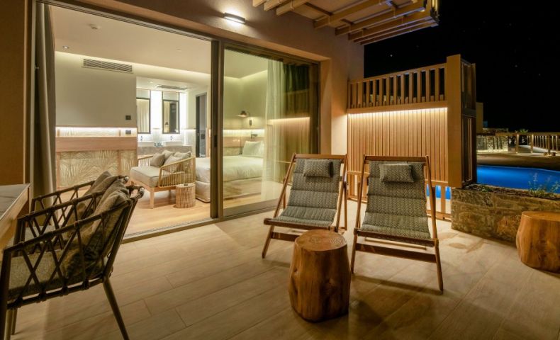 В стаите: Стаите са оборудвани с всички удобства. Предлагайки стаи с изглед към морето и частен басейн, луксозни апартаменти с частни външни джакузита, както и просторни стаи и апартаменти за семейства. Стаите са оборудвани с телевизор с плосък екран със сателитни канали, хладилник, сешоар и тоалетни принадлежности, както и с високоскоростен Wi-Fi интернет. Гостите могат да направят своя избор от стаи с изглед към градината или морето, частен басейн или външно джакузи и да се насладят на престой в Крит.