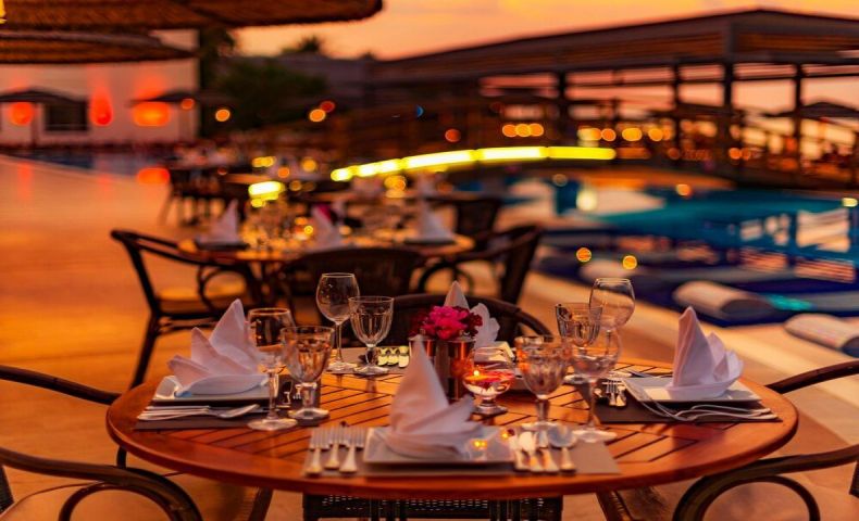 Oсновен ресторант Karya, два а-ла-карт ресторантa (турски Begonvil и рибен Teras Seafood - с предварителна резервация, едно безплатно посещение за престой от минимум три нощувки), 6 бара - Palm Bar, Roof Bar, Pool Bar, Sea Bar, Snack Bar и Olive Bar.