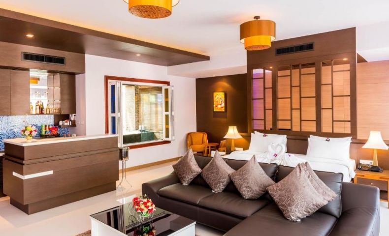Grand Nipa Suite - 56 m2,  Просторен апартамент с дизайнерски елементи, които включват комбинация от класически тайландски и модерен лукс. Апартамента има едно голямо двойно легло, допълнителен диван, една баня с душ и хидромасажна вана, малък кухненски бокс, работно бюро, изглед към града. Оборудвана е с индивидуален климатик, самостоятелен балкон, сейф, телефон, сателитна телевизия, сешоар, мини бар, сет за приготвяне на чай и кафе.
