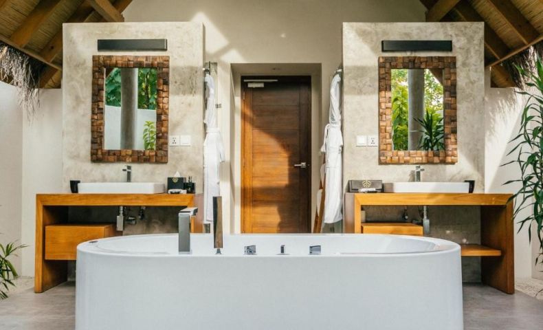 Вила от 122 кв.м с king size легло за 3-ма възрастни, с частен басейн и директен изход към плажа и лагуната „Etherevari“, предлагаща уединение сред тропическа растителност, външен душ и вана под звездите.