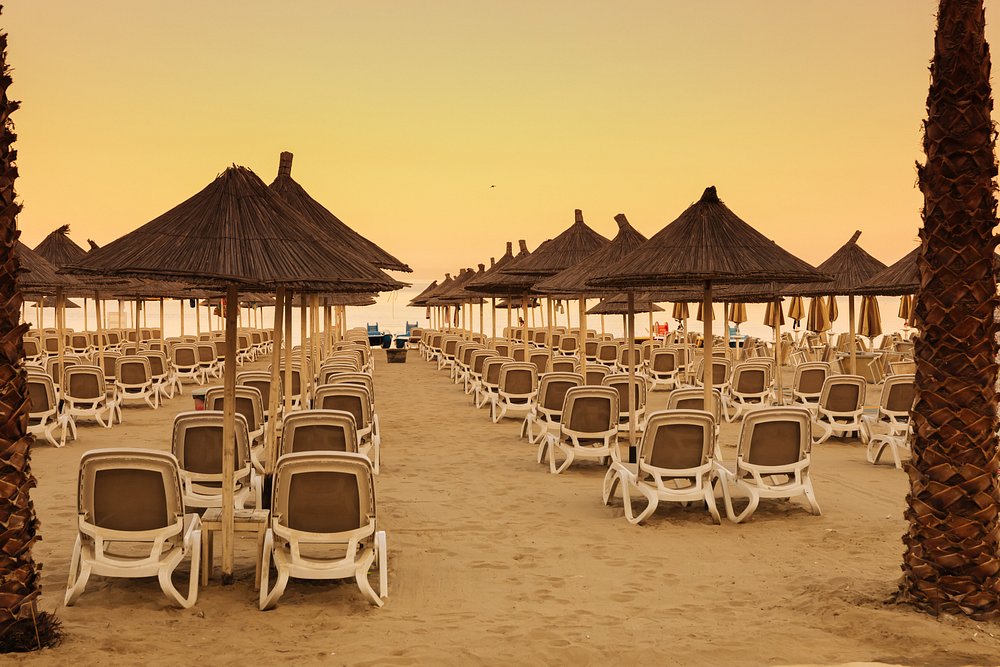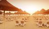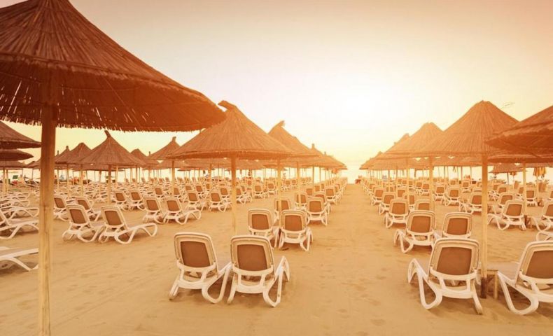 Собствен - пясъчен, на 150 м. от хотела. Чадъри и шезлонги на плажа и басейна - безплатно.