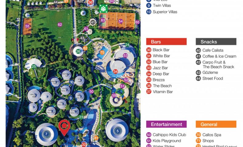 Основен ресторант, 6 а - ла - карт ресторанта (с предварителна резервация), 8 бара, VIP ресторант, дискотека, 4 открити и 2 закрит басейна, 4 водни пързалки, магазини, Спа център, конферентни зали, паркинг.
