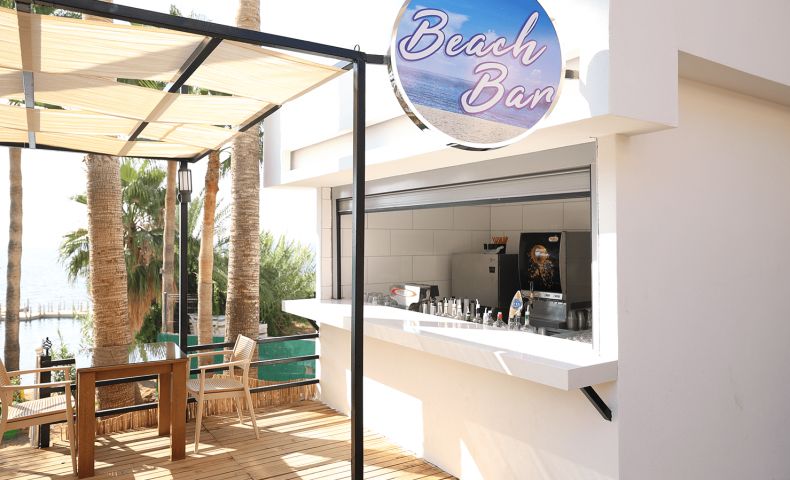 Собствен, пясъчно - чакълест. Чадъри, шезлонги и плажни кърпи на плажа и при басейна – безплатно.