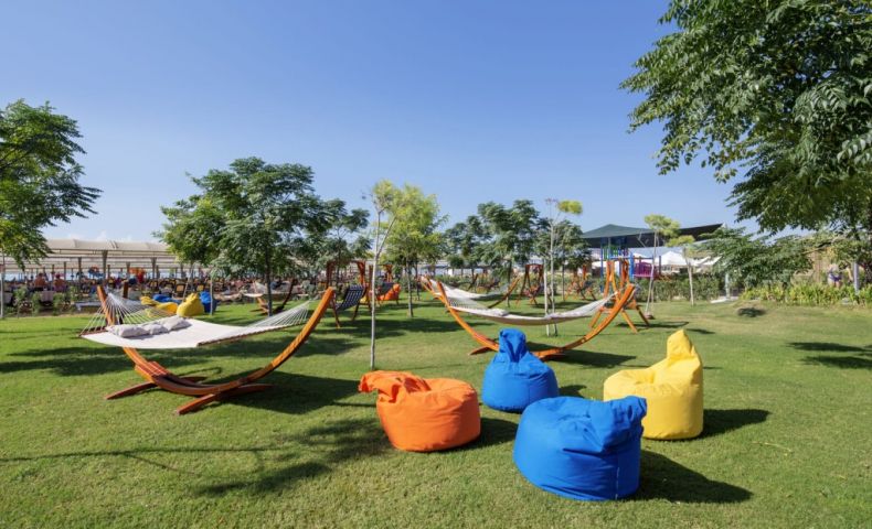 Плаж: Собствен пясъчен плаж в непосредствена близост от сградата на хотела. Чадъри, шезлонги, и плажни кърпи (1 път на ден, взимат се от спа центъра с карта) са безплатни. Ресторант на плажа