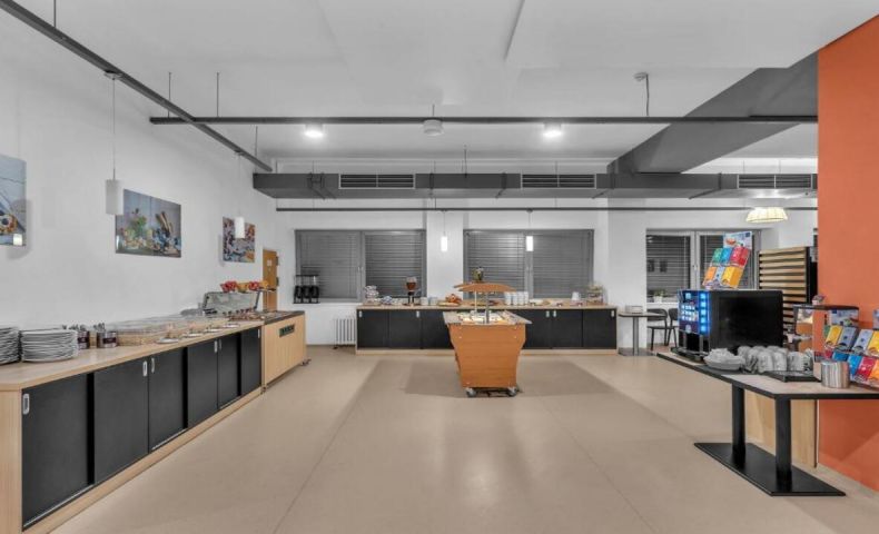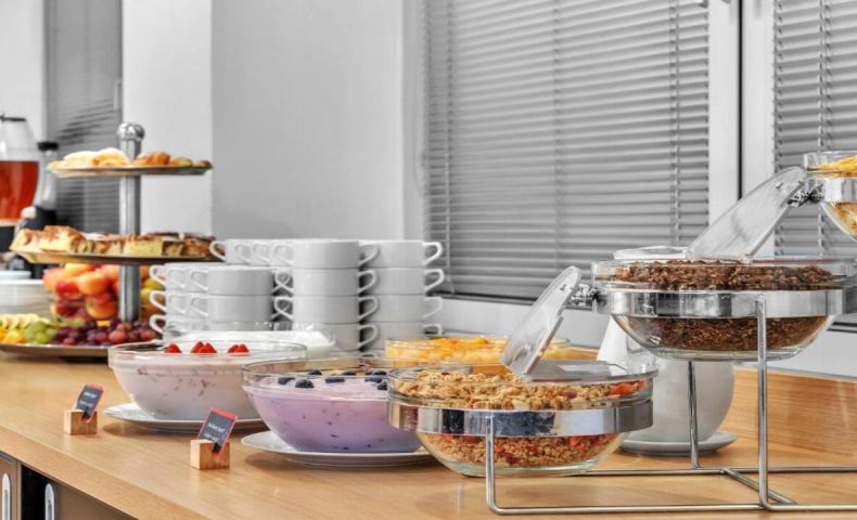 Хотелът разполага със светла зала за закуска, където се предлага континентална закуска на блок-маса – хляб, масло, конфитюр, зърнени храни, колбаси, сирена, плодове, кафе, чай и сокове