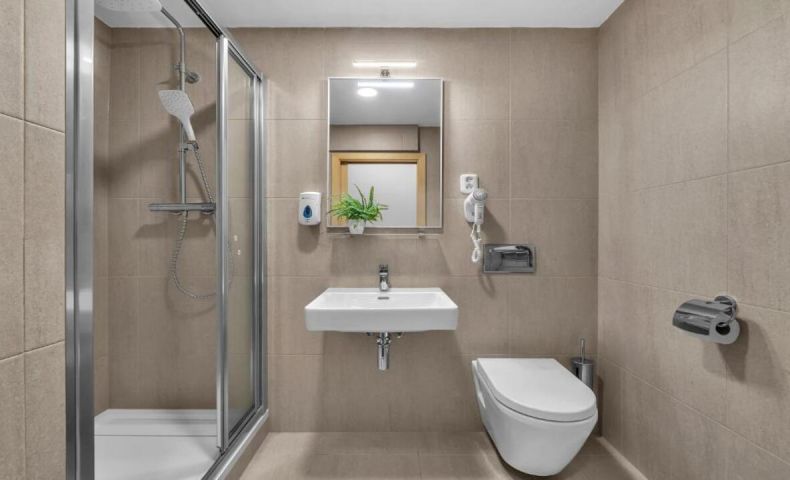 Всички стаи са обзаведени с основни мебели: легла с удобни матраци, гардероб, бюро, телевизор с плосък екран, минихладилник, самостоятелна баня с душ, тоалетни принадлежности и сешоар. Стаите разполагат с централно отопление и добри шумоизолационни прозорци.