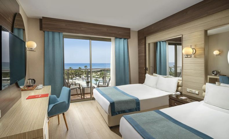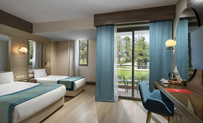 Standard room Land view (изглед суша - 25 м2), Standard room Sea view (изглед море - 25 м2), Superior room Pool view (изглед басейн - 40 м2), Superior room Lake and Garden view (изглед градина - 40 м2), Superior Garden room Terrace (с частна тераса към градината - 40 м2), Family Suite room (2 спални, 1 баня - 36 м2).