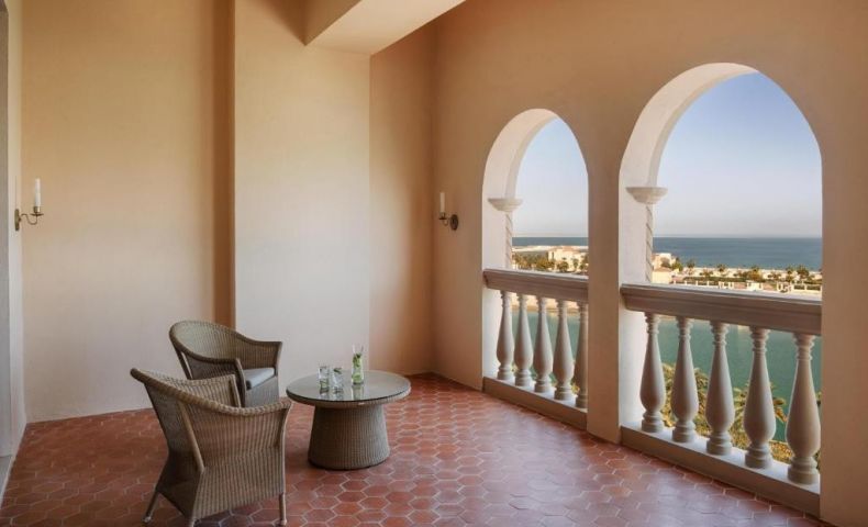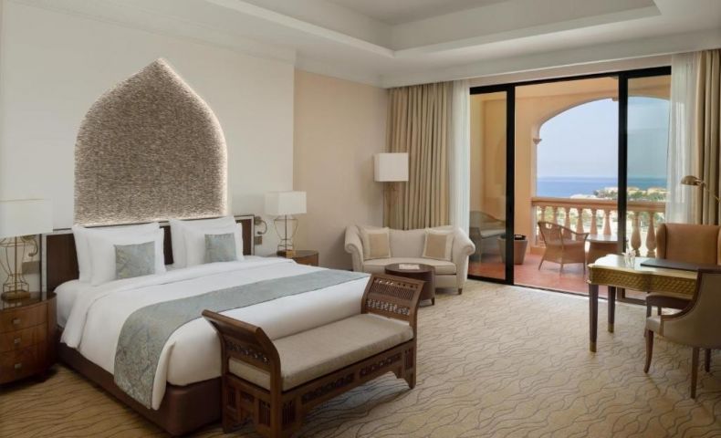 Deluxe Room Sea View, 1 легло King (220x200 см) или 2 единични легла (110x200 см), просторен балкон и тераса с изглед към Marsa Malaz и спокойните сини води на Арабския залив, с интериор в топли пустинни тонове и уютни мебели.