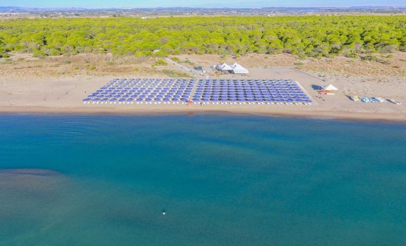 Намира се на 500 метра от хотела и може да бъде достигнат по пътеки през уникална красива пиниева гора, където ще се насладите на девствената природа на Йонийско море. Наличен е и трансфер до плажа. На стая се полагат 1 чадър и 2 шезлонга. Пясъчен плаж, ситен пясък, пясъчно дъно.