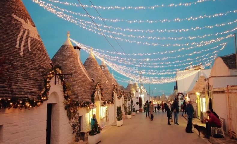Алберобело – посещение на приказната столица на трулите. Алберобело е град с толкова особено обаяние, че е трудно да се ориентирате къде се намирате. Столицата на Трулите сякаш ви пренася в детска книжка с приказки. Трулите са малки бели къщички от варовик с конусовидни покриви. Градени в миналото без всякаква спойка, те наподобяват по форма ескимоско иглу. В близост до главния площад се намира църквата „Санта Лучия”, както и градския музей „Територио”. Музеят е направен от 10 трули обединени в една. В музея може да се види историята на създаването на трулите и как обитателите им са живеели в тях в миналото. Алберобело има и други музеи, които предлагат на туристите сувенири и почти всичко, което една селска къща произвежда. Някой от поинтересните са: Музея на виното и Музея на зехтина. В цената е включена дегустация на домашно произведени ликьори и сладки. Локоротондо – едно от 100-те най-красиви малки градчета в Италия, чийто историческия център е застроен в овална форма, откъдето идва и името му. Градът е записан в книгата на рекордите на Гинес, заради петте гласни „о“ в името си. Това е град на красивите балкони, повечето от които си имат номера. Градът е известен и със своите вина.