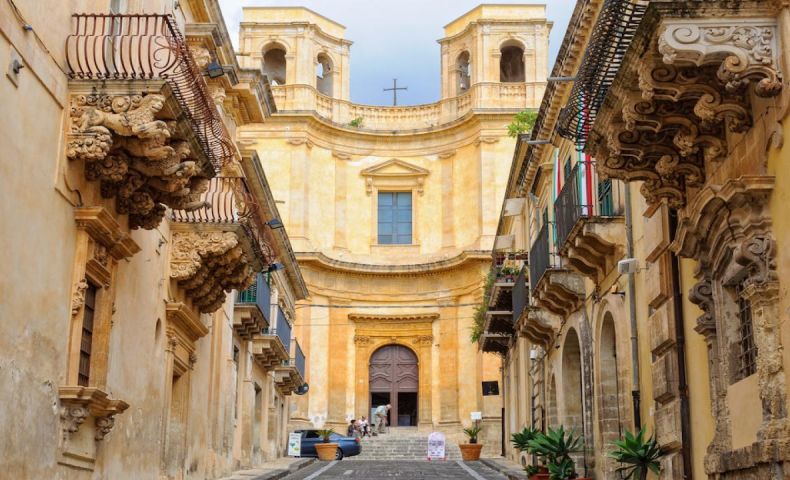 Туристическа програма с местен екскурзовод по централната улица „Виторио Емануеле“, където ще видите: внушителната Катедрала на Ното, църквите и манастирите от XVIII век, прочутия дворец „Палацо Николачи“ с най-красивите барокови балкони в света - пищно украсени с маски, грифони и кентаври.